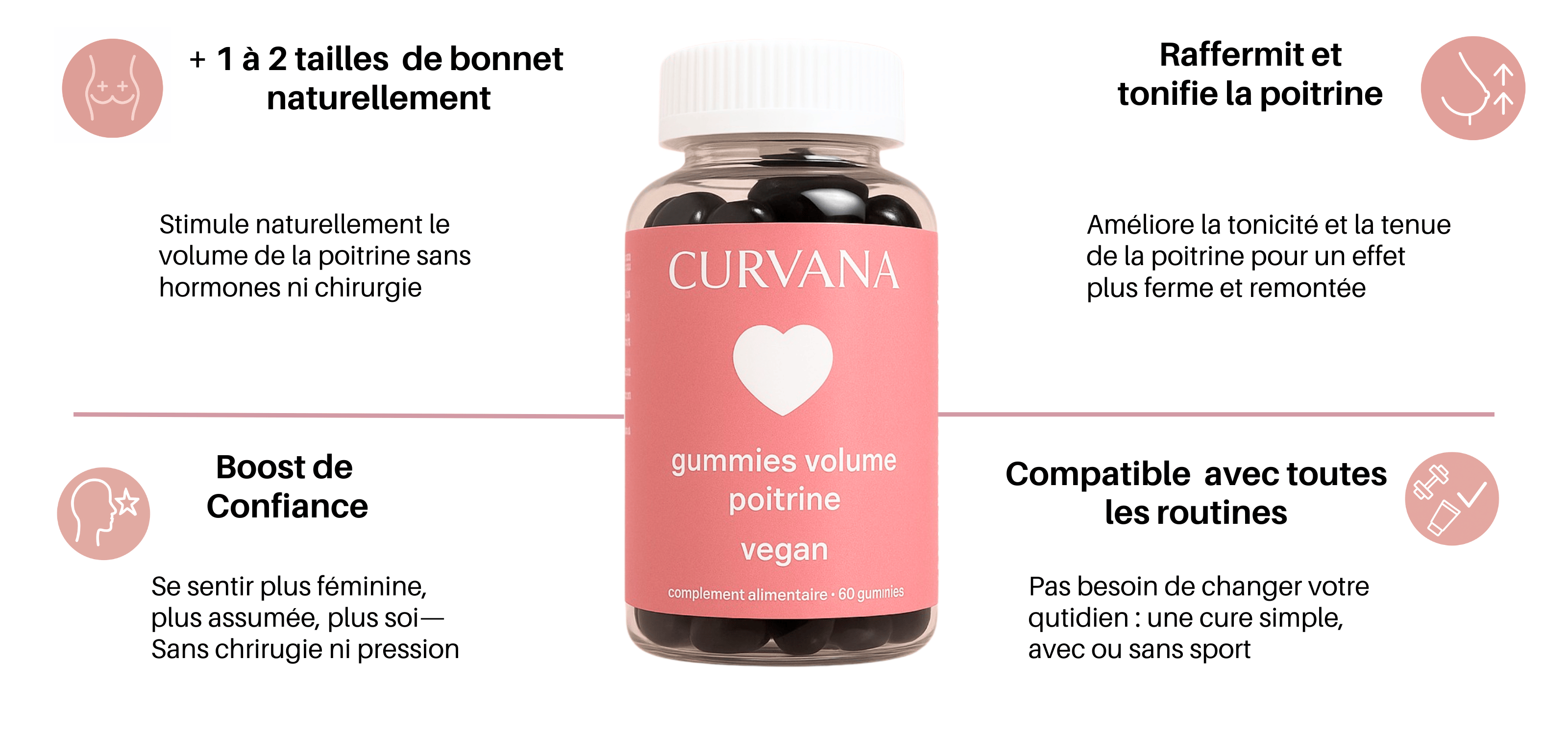 Rundung, Straffheit, natürliches Volumen: Die Curvana Gummies wirken gezielt auf die Brust, um das Dekolleté zu festigen, zu straffen und neu zu formen – ohne den Rest des Körpers zu beeinflussen.