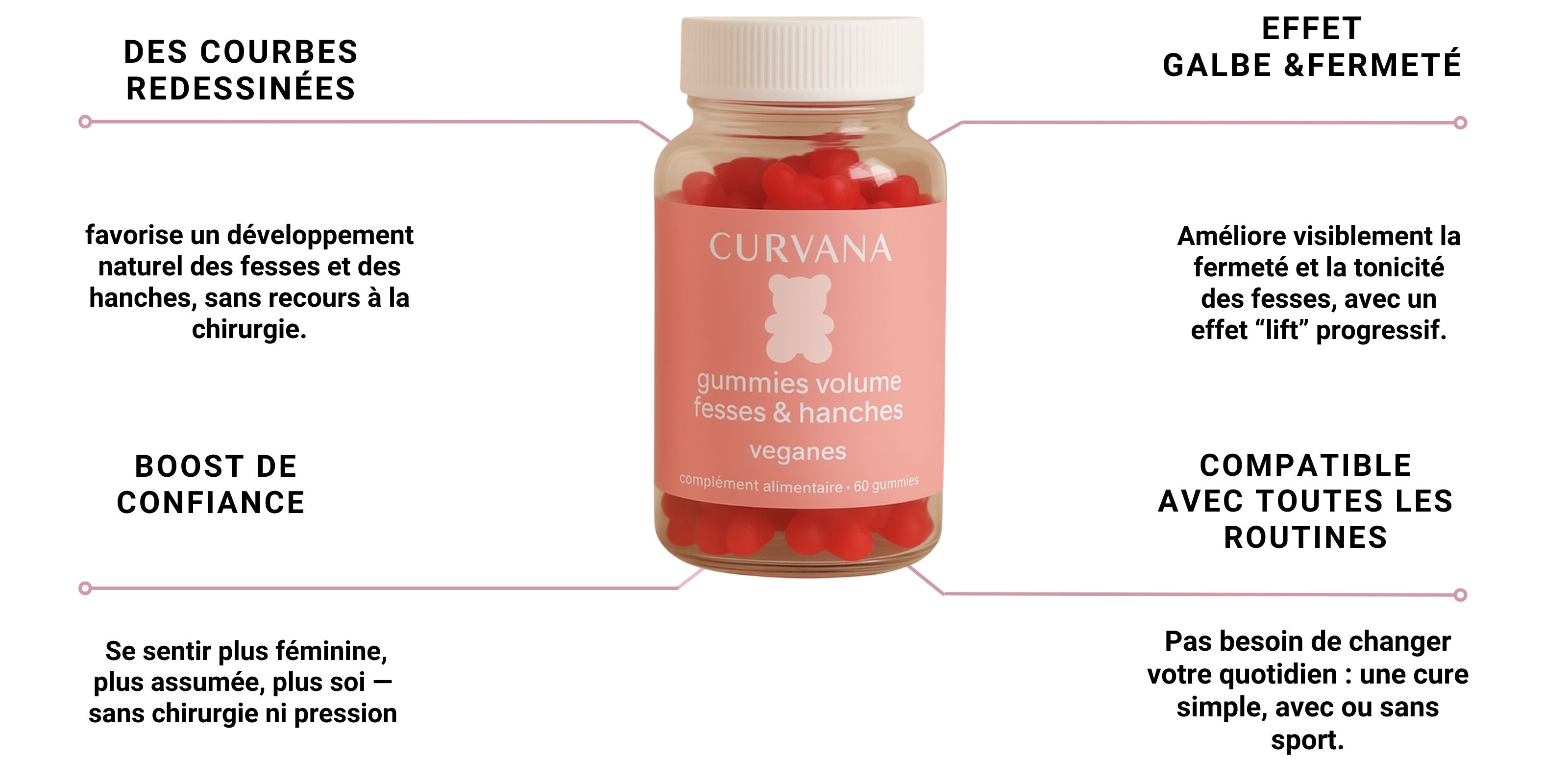 *Des résultats visibles dès 3 semaines ! Les gummies Curvana sont 100 % naturelles, sans hormone, et ciblent exclusivement les fesses et les hanches, sans prise de volume sur les autres zones du corps.